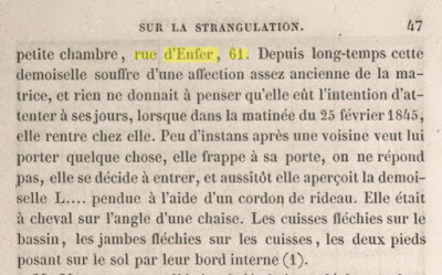 La demoiselle L... Stéphanie, âgée de trente-quatre ans, native de Langres (Haute-Marne), rentière, occupe une petite chambre, rue d'enfer, 61. Depuis longtemps cette demoiselle souffre d'une affection assez ancienne de la matrice, et rien ne donnait à penser qu'elle eût l'intention d'attenter à ses jours, lorsque dans la matinée du 25 Février 1845, elle rentre chez elle. Peu d'instants après, une voisine veut lui porter quelque chose, elle frappe à sa porte, on ne répond pas, elle se décide à entrer, et aussitôt elle aperçoit la demoiselle L.. pendue à l'aide d'un cordon de rideau. Elle était à cheval sur l'angle d'une chaise. Les cuisses fléchies sur le bassin, les jambes fléchies sur les cuisses, les deux pieds posant sur le sol par leur bord interne.